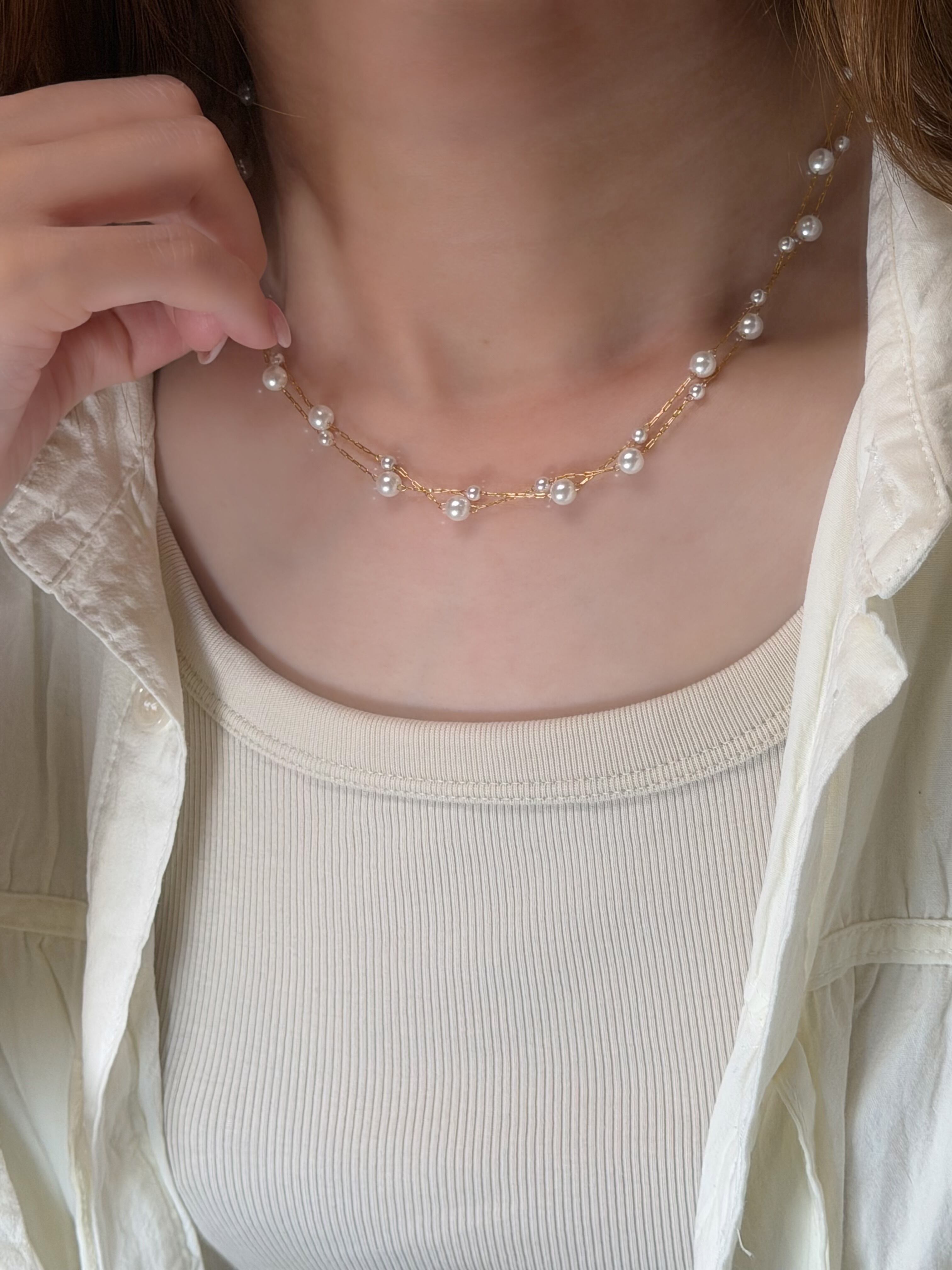# パーテーションパールネックレス 素材: シードパール、ステンレススチール サイズ: 40cm + 5cmアジャスター (ご入浴後は柔らかいタオルで水気をしっかりお取りください) #エレガント #シンプル #おしゃれ